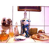 Unsere Neuheit in diesem Monat: Tiffany-Mosaik-Lampenflaschen. Viel Geduld, Vorstellungsvermögen und eine ruhige Hand wenden wir auf - aber das Ergebnis lohnt sich: Durch die Ausgewogenheit der Materialien sieht diese Flaschenart sowohl bei Tageslicht als auch im Dunkeln sehr gut aus. Wir haben hier transparente capriblaue und grüne Mosaiksteinchen verwendet, die beleuchtet sehr schön strahlen. Die edlen Perlmutt-Stücke sind durchscheinend und leuchten dafür intensiv tagsüber in schillernden Spektralfarben . Echt-Perlmutt-Mosaik wird aus der (Macabebe) Fluss-Muschel gewonnen.