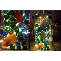 Unsere Neuheit in diesem Monat: Tiffany-Mosaik-Lampenflaschen. Viel Geduld, Vorstellungsvermögen und eine ruhige Hand wenden wir auf - aber das Ergebnis lohnt sich: Durch die Ausgewogenheit der Materialien sieht diese Flaschenart sowohl bei Tageslicht als auch im Dunkeln sehr gut aus. Wir haben hier transparente capriblaue und grüne Mosaiksteinchen verwendet, die beleuchtet sehr schön strahlen. Die edlen Perlmutt-Stücke sind durchscheinend und leuchten dafür intensiv tagsüber in schillernden Spektralfarben . Echt-Perlmutt-Mosaik wird aus der (Macabebe) Fluss-Muschel gewonnen.