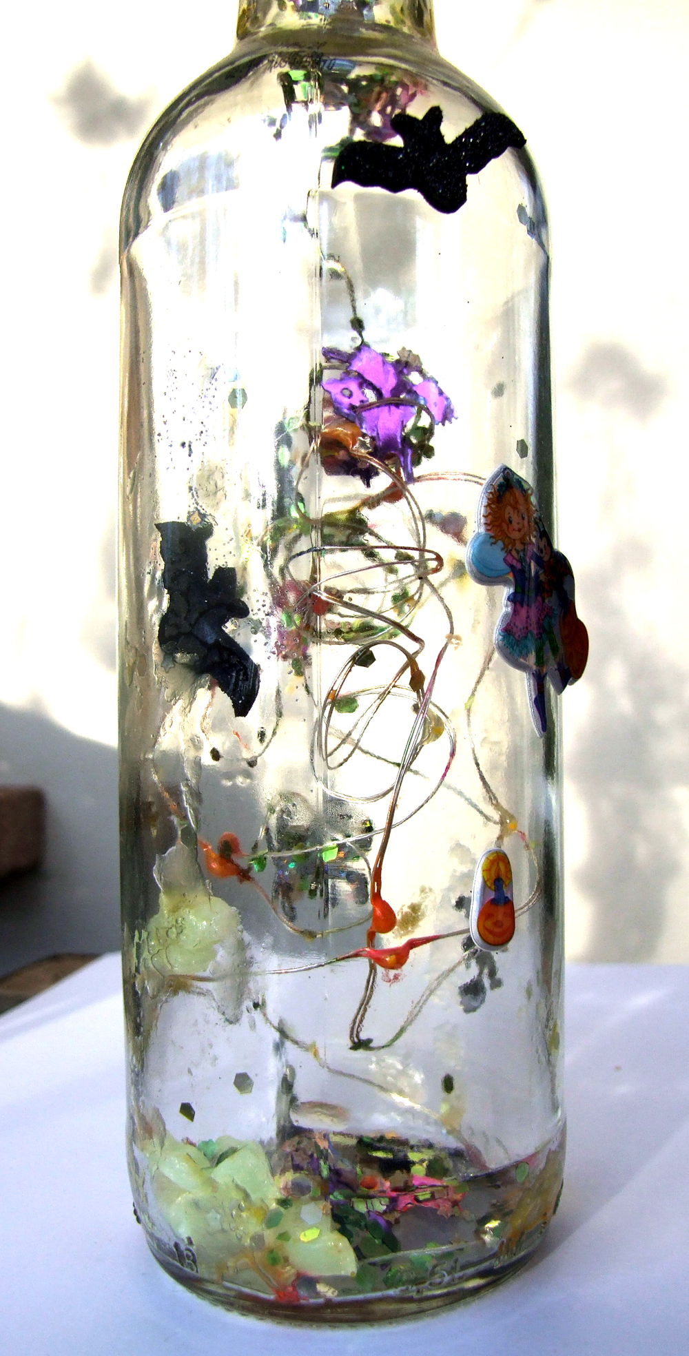 | | Prinzessin L. feiert Halloween. Mit ganz ganz viel Glitzer - eben ganz prinzessinenhaft. Die Lämpchen leuchten in gelb-orange. Kürbisse, Fledermäuse, eine große Spinne in schwarz, eine kleinere in Silber-Glitzi, kleine Hexen auf dem Besenstiel und kleine fluroszierende Gespenster schweben in der upcycelten Flasche; mit jeder Menge Glitzer. Diese Flasche wird jedes Mädchenherz höher schlagen lassen!
