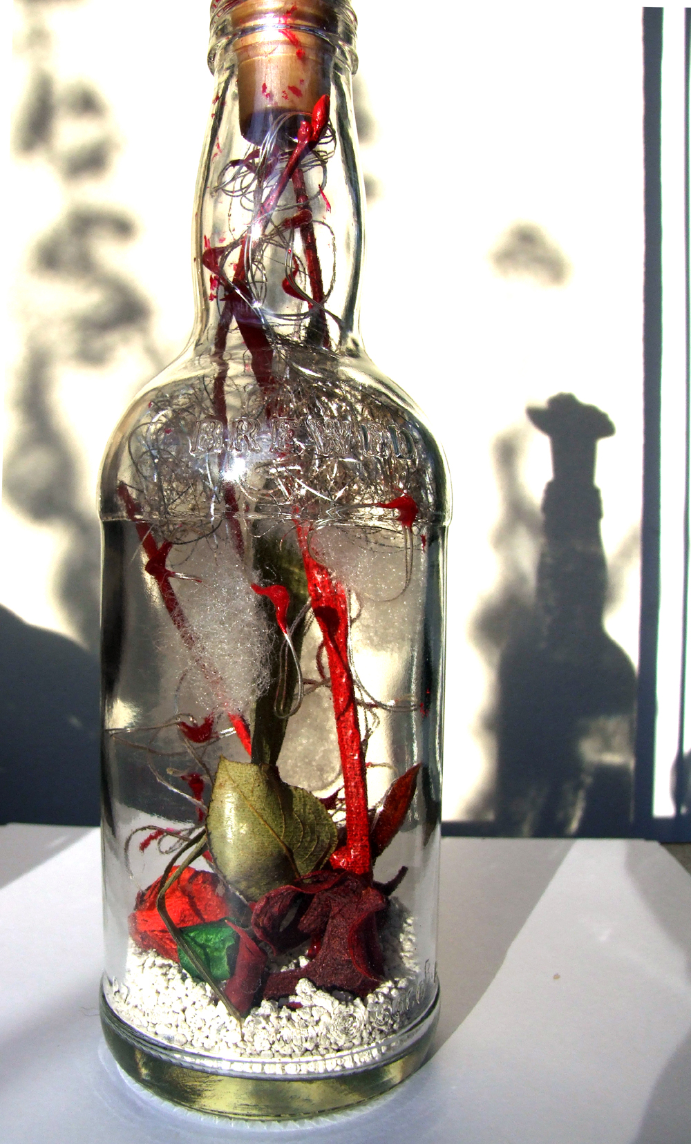 | | Eleganz pur: In der typischen Art déco-Form dieser Flasche, sind edle Dinge arrangiert - Schwarze Feder, Spiegelstücke, kleine Miniatur-Tannenzäpfchen. Um die schlanke Form zu untermalen wurden weiße und lindgrüne zarte Äste verwendet - die typischen Farben des zeitlos schönen Art déco. Die Lämpchen sind ebenfalls in weiß und lindgrün gehalten. Eine schlanke Schönheit - eine richtige Louisette!