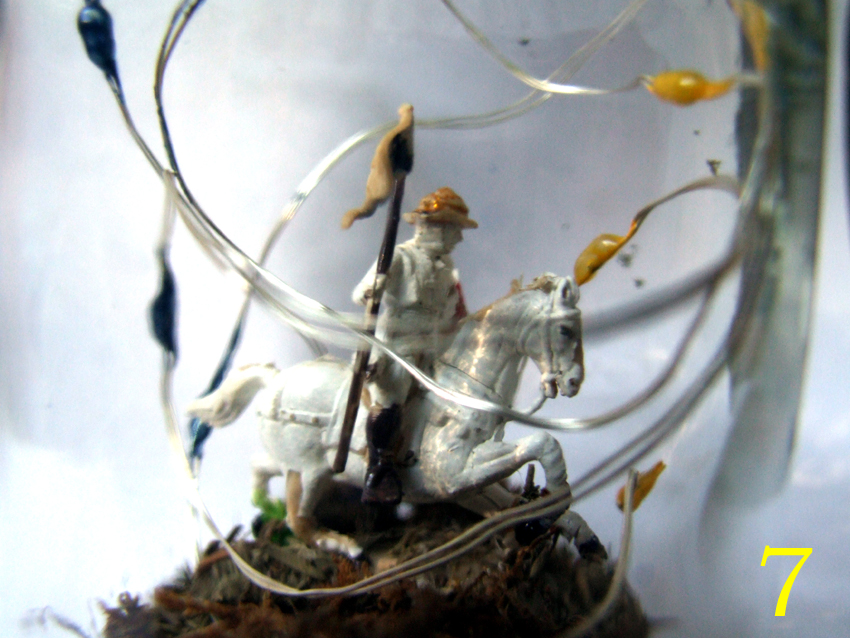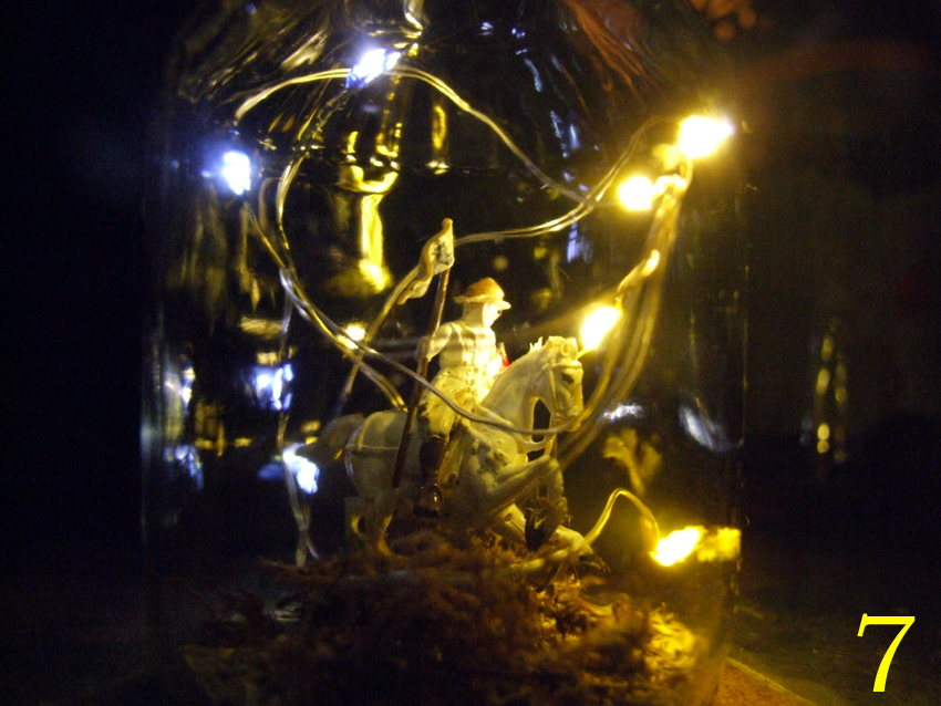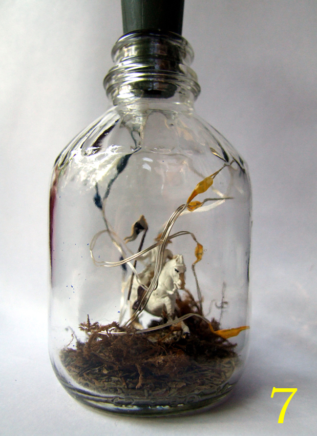 Eine Miniaturflasche, 13,5 cm hoch, mit Modellbaufigur eines Pferdes und eines Reiters, handbemalt in naturnaher Umgebung. Ein Mini-Diorama für den Schreibtisch oder für das Bücherregal.