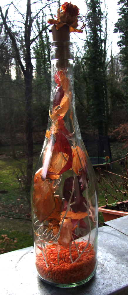 Orange- und bordeauxrote Töne und den Gegenpol bilden weiße Ästchen; die Lämpchen leuchten in gelb und orange –