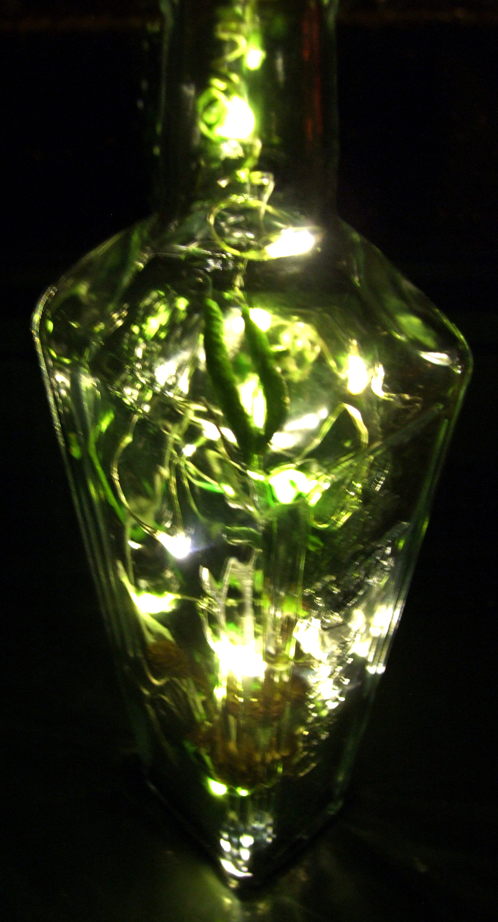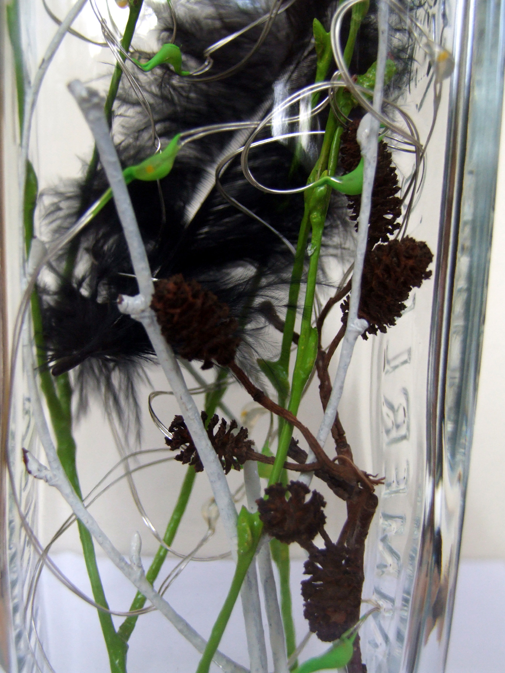 Eleganz pur: In der typischen Art déco-Form dieser Flasche, sind edle Dinge arrangiert - Schwarze Feder, Spiegelstücke, kleine Miniatur-Tannenzäpfchen. Um die schlanke Form zu untermalen wurden weiße und lindgrüne zarte Äste verwendet - die typischen Farben des zeitlos schönen Art déco. Die Lämpchen sind ebenfalls in weiß und lindgrün gehalten. Eine schlanke Schönheit - eine richtige Louisette!