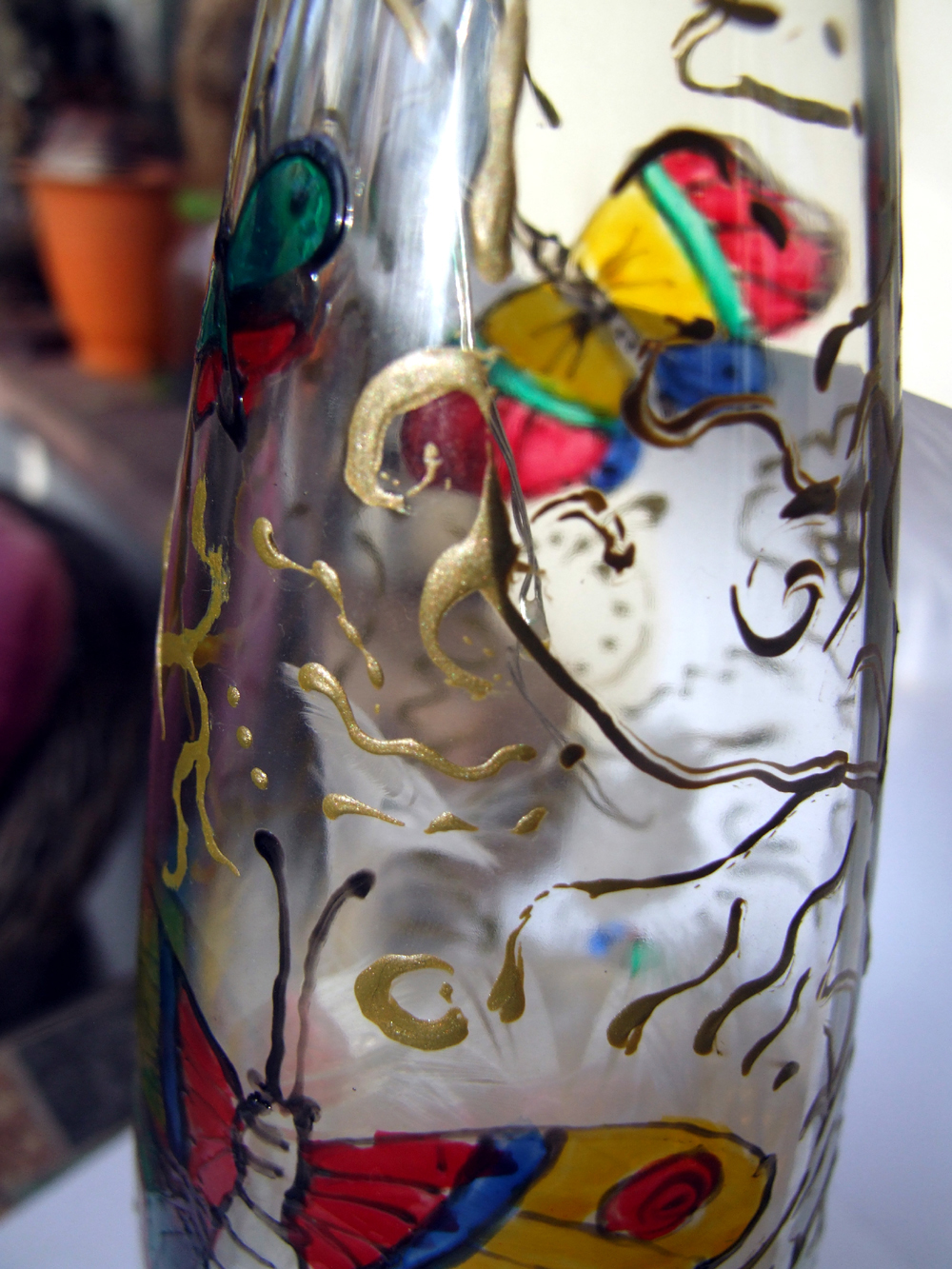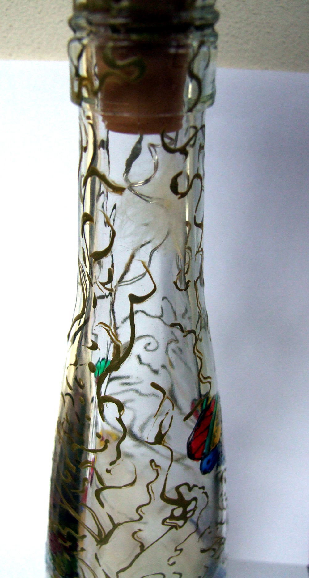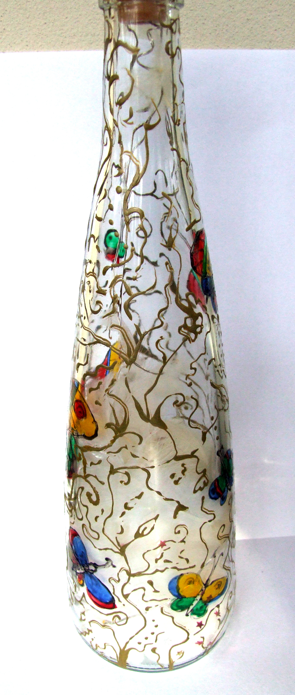 Eine handbemalte wunderschöne Flasche – die Schmetterlinge sind mit bunter transparenter glasmalfarbe und schwarzer reliefpaste gemalt. Die Ranken sind mit goldfarbener Reliefpaste gezeichnet.